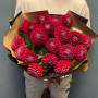 На фото букет из 19 красных георгин. В составе: георгина 19 шт, крафт-бумага 1 шт, атласная лента 1 шт, . Все цветы свежие и ароматные, букет красиво оформлен и отлично подходит для подарка. Доступна доставка цветов или самовывоз.