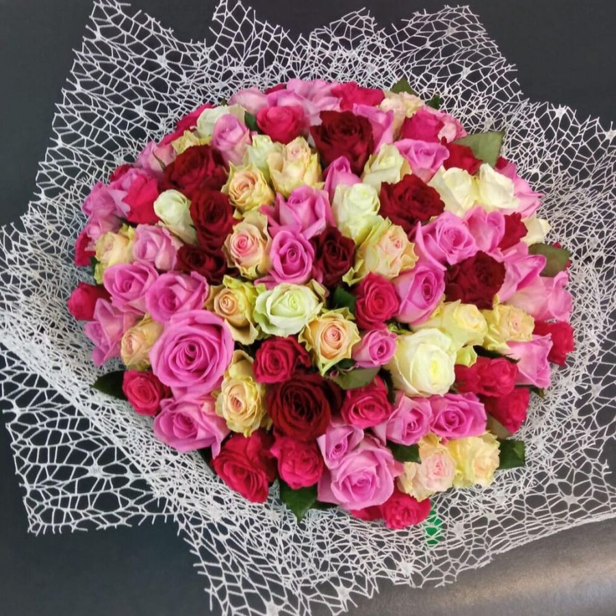 На фото букет из 75 кенийских роз. В составе: роза 75 шт, фетр 1 шт, атласная лента 1 шт, . Все цветы свежие и ароматные, букет красиво оформлен и отлично подходит для подарка. Доступна доставка цветов или самовывоз.